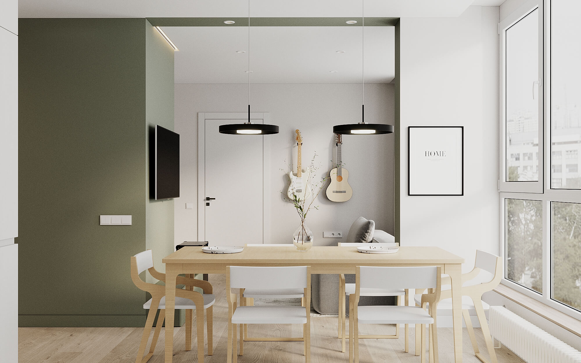 Природне світло наповнює квартиру. Сучасні великі вікна є ключовим елементом, який забезпечує достатню кількість світла. Власне, і оздоблення вікон є гармонійним доповненням цього стилю.